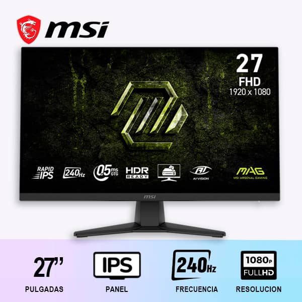 - Monitor gaming MSI MAG 272F X24 de 27″ con panel Rapid IPS y resolución Full HD (1920 × 1080), perfecto para juegos dinámicos y uso general con alta fluidez. :contentReference[oaicite:0]{index=0}